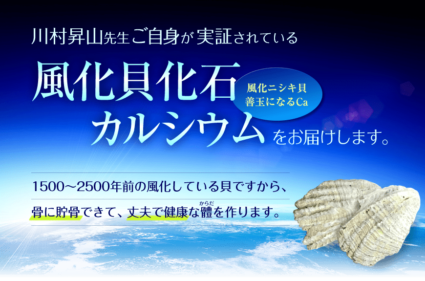 ※風化ニシキ貝でも焼成・高温処理をしたものや抽出加工したものを加えたものは、善玉カルシウムの働きはできません。川村昇山先生から、骨の改善にならないことが指摘されています。