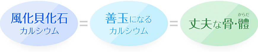 素材を抽出・濃縮・高温・高圧処理をしない、未焼成のカルシウムです。非活性・非イオン化カルシウムですので、緑黄色野菜等と同じように体の中へはいってから、ゆっくりジワジワと吸収されます。確実に骨に入り丈夫な骨になり貯骨できます。体にやさしくカルシウムが補給できますので、善玉カルシウムと呼ばれます。